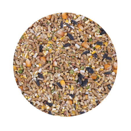 Granulado (bagaço de soja descascada e torrada obtido por extração (2), sêmea de trigo, milho (1), trigo, carbonato de cálcio, fosfato monocálcico, óleo de soja, cloreto de sódio, bicarbonato de sódio), milho, trigo, carbonato cálcio granulado, sorgo, ervilha, cevada, girassol, cártamo, linhaça