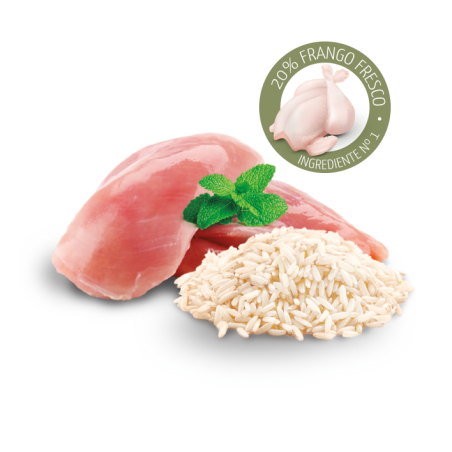 Frango desidratado, Frango fresco (20%), Arroz, Trigo, Cevada, Gordura de aves, Milho, Polpa de beterraba, Hidrolisado de fígado de aves, Substâncias minerais, Óleo de peixe, Leveduras, Ovos desidratados, Chicória.