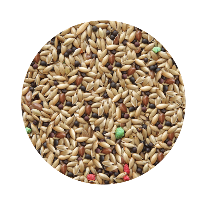 Alpista, colza, linhaça, cânhamo, biscoitos multicores (farinha trigo, sal), corantes.