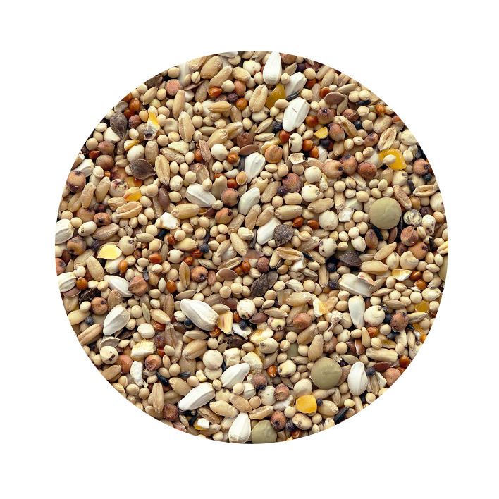 Trigo, milho alvo, sorgo vermelho, cártamo, dary, alpista, milho triturado, aveia descascada, lentilhas, alvo vermelho, trigo sarraceno, níger, colza, linhaça.