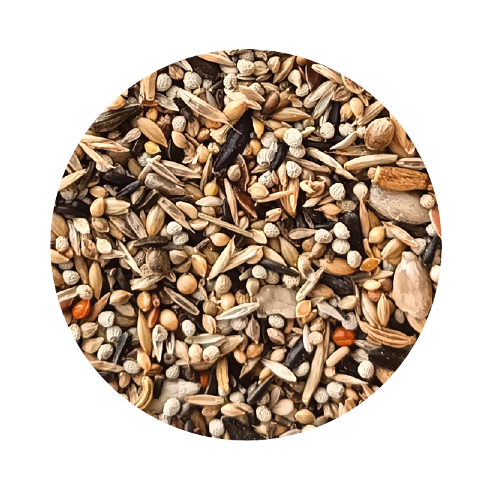 Alpista, Níger, perilha, milho alvo vermelho, milho alvo japonês, milho alvo branco, girassol micro preto, milho painço, linhaça, cânhamo, miolo de girassol, cardo maria, chicória, luzerna, alface, gramíneas, sésamo, papoila e funcho.