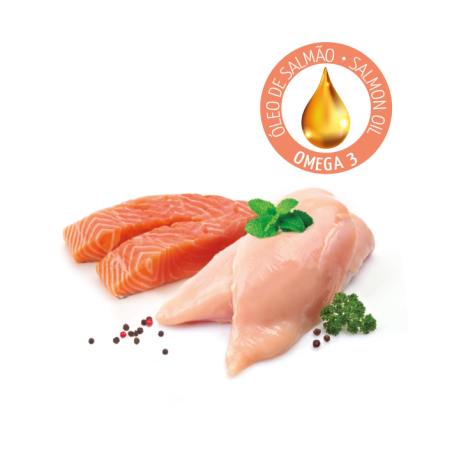 Frango fresco (20%), derivados de trigo, hidrolisado de aves, legumes, cevada maltada, arroz integral, proteína de milho, fibras vegetais, milho inteiro, gordura de frango, fermento de cerveja, hidrolisado de fígado de frango, lignocelulose, óleo de salmão rico em ómega 3, atum, vitaminas, minerais, frutas e vegetais (cenoura, maçã, feijão verde, couve-rábano), ovo desidratado (min. 1%), cloridrato de glucosamina, sulfato de condro tina, vegetais, (calêndula, sálvia, feno-grego, flor de calêndula, equinácea , endro), extrato de mexilhão de lábios verdes, taurina, mana oligossacarídeos, extratos vegetais (bagas vermelhas, dente de leão, folhas de hortelã, semente de chá verde, tomilho, alecrim), pré-bióticos, antioxidantes naturais, probióticos, acidificantes.