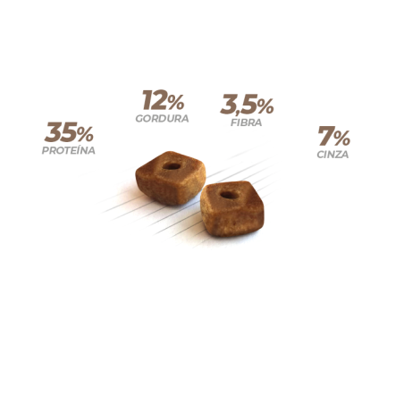Proteína: 35%, Gordura: 12%, Fibra: 3,5%, Cinza: 7%, Humidade: 10%