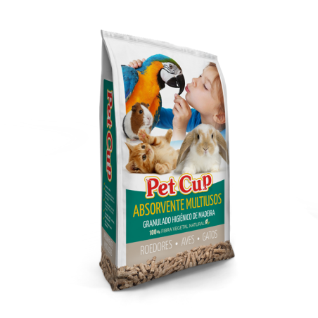 Pet Cup absorvente multiusos, é um produto 100% de fibra vegetal natural e super absorvente, composto por aparas granuladas de madeira com aroma natural, indicado para a higiene de animais de estimação como, roedores, pequenos mamíferos, pássaros e gatos. Pet Cup absorvente multiusos reduz e controla os odores, mé produzido sem a utilização qualquer tipo de aditivos químicos e 100% biodegradável.