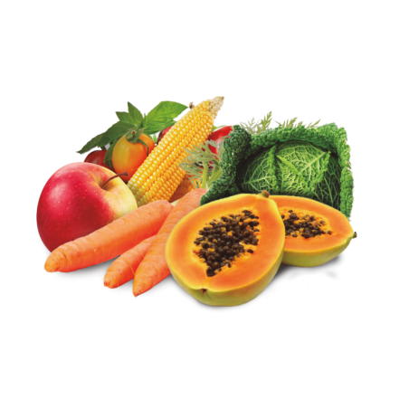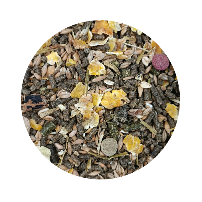 Aveia, trigo, floco de milho, cevada, luzerna, alfarroba, vegetais extrusionados, frutos desidratados e biscoitos multicores.