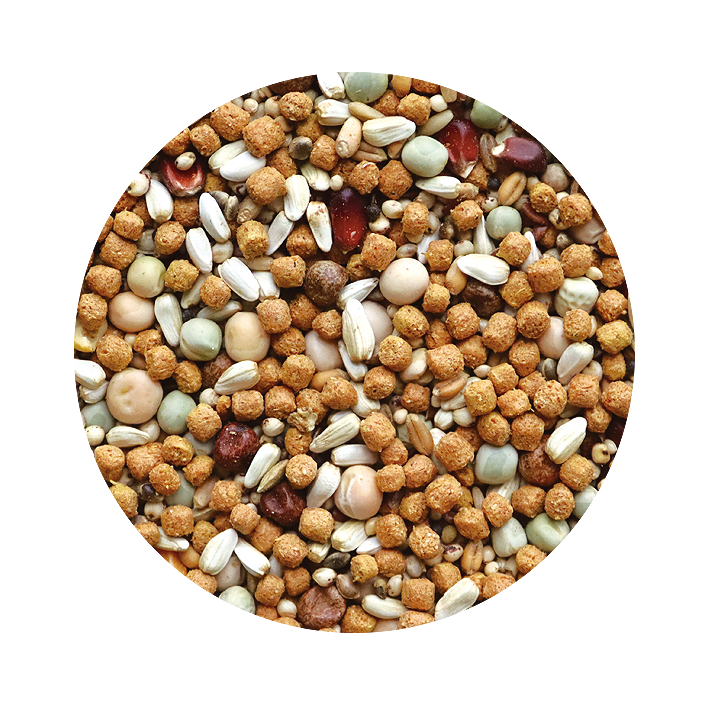 Cartamo, sorgo, ervilhas, trigo, milho alvo, milho miudo vermelho, colza, linhaça castanha, canhamo, aveia descascada, biscoito.