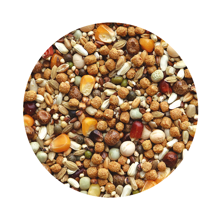 Cártamo, milho, ervilhas, sorgo, trigo, sorgo vermelho, milho miúdo vermelho, linhaça castanha, milho alvo, arroz com casca, miolo de girassol, ervilhaca, feijão mung, biscoito.